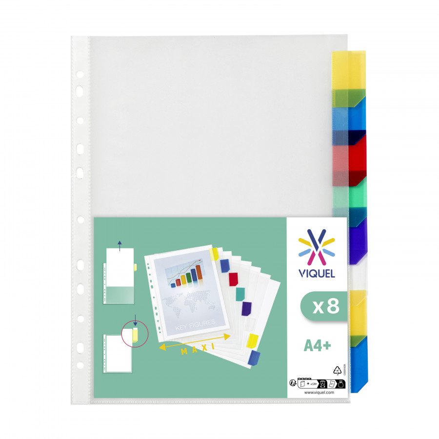 Ces 8 pochettes intercalaires sont en plastique transparent résistant. Ces pochettes sont particulièrement astucieuses avec une double fonction : ce sont à la fois des pochettes perforées et des intercalaires avec 8 onglets multicolores. Une planche d'étiquettes en carton léger est fournie. Ces étiquettes permettent l'identification des onlgets. Ces pochettes intercalaires sont idéales pour le classement de documents de format A4 au bureau comme à la maison.