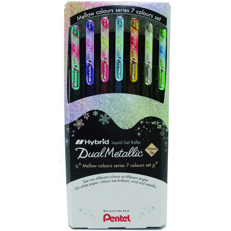 Roller encre gel métallique Encre gel métallisée irrisée, 2 effets de couleur : 1 roller = 2 couleurs Selon l’angle de vue ou selon le support papier utilisé, l’encre métallique offre une couleur différente Sur papier blanc, les couleurs sont brillantes, lumineuses et irrisées. Sur papier noir, elles sont métallisées. Ecriture douce et nette, les lignes...