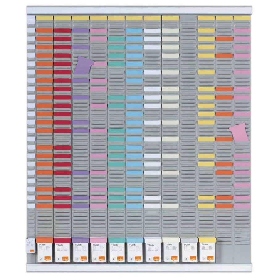 Ce système d'organisation robuste se compose de 12 colonnes (indice 2) pour les mois de l'année et d'une colonne d'index (indice 1) pour les priorités ou les noms des collaborateurs. Chaque colonne dispose de 54 fentes, permettant une planification dense et détaillée. L'installation est simplifiée grâce à un kit de montage rapide et des rails en aluminium élégants qui assurent la stabilité de la structure de 80 x 96 cm.