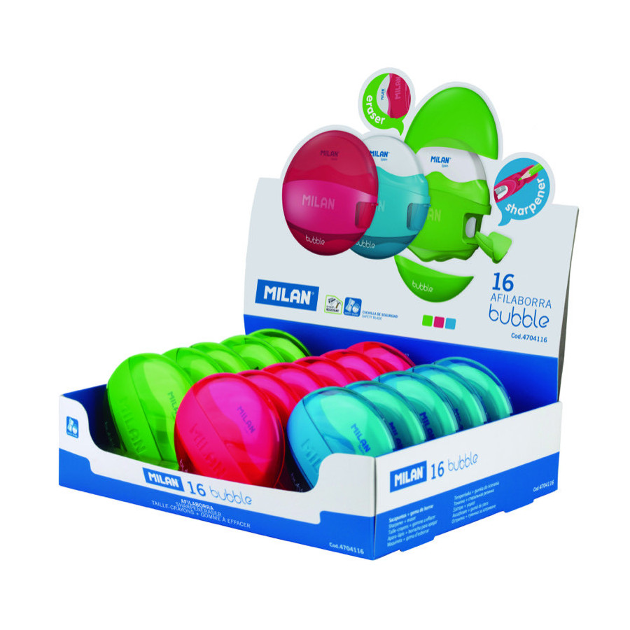 Lassociation dune gomme et dun taille-crayon. Le taille-crayon possède une lame en acier carbone, coupante et résistante, idéale pour tout type de crayons. Article avec une lame de sécurité. Ce système empêche la séparation de la lame et du corps du taille-crayon. Idéal pour un usage scolaire. Couleurs assorties aléatoires : bleu, rose, vert.