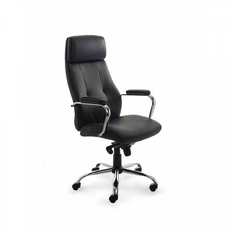 Chaise pivotante avec assise et dossier rembourrés en similicuir avec base en métal chromé et mécanismes synchro. Appui-tête intégré et accoudoirs en métal chromé avec top-line amorti en série.
