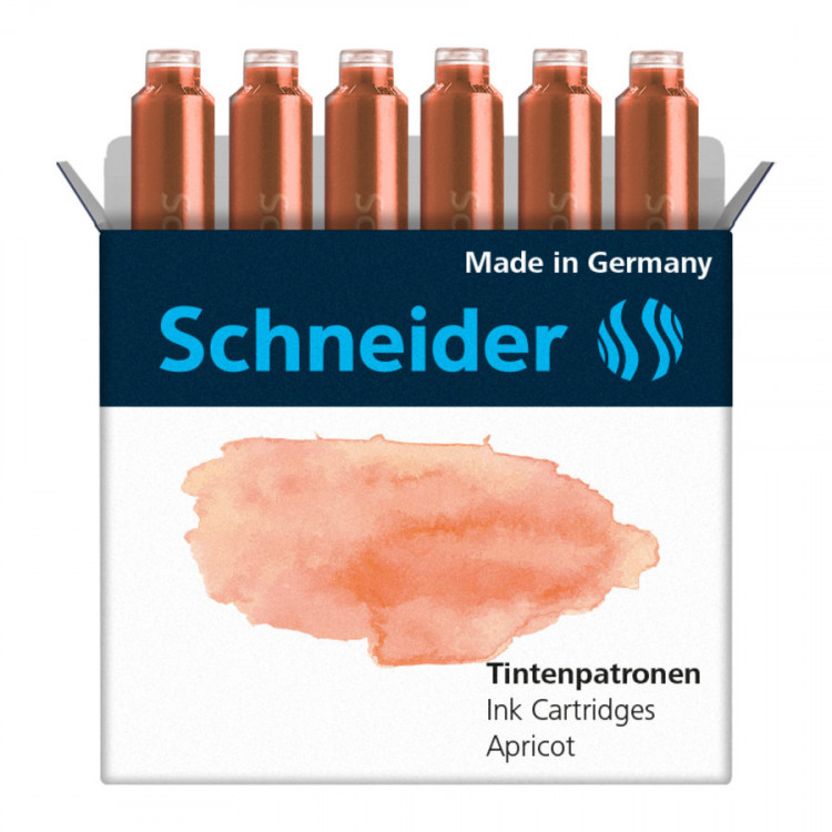 Cartouches d'encre pastel unique en couleur d'encre "Apricot", avec lesquelles chaque style d'écriture prend tout son sens et il n'y a pas de limites à la créativité. Convient aux produits Schneider et à la plupart des stylos à plume et rollers à cartouche. Une boîte avec 6 cartouches d'encre. Qualité made in Germany.