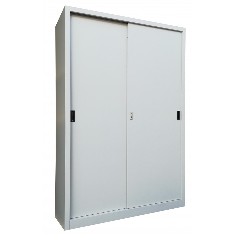 ARMOIR METAL A PORTES COULISSANTES CM 120X 45 H200 LAQUE' EPOXY LISSSE GRIS RAL 7035- SERRURE DE SECURITE' A CLE' ET POIGNEE'S EN PLASTIQUE EQUIPE' AVEC 4 TABLETTES METAL REGLABLES EN HATEUR ET REPLIS POUR DOSSIERS SUSPENDUS ARMOIRE . LIVRE' DEMONTE' (2 COLIS ).