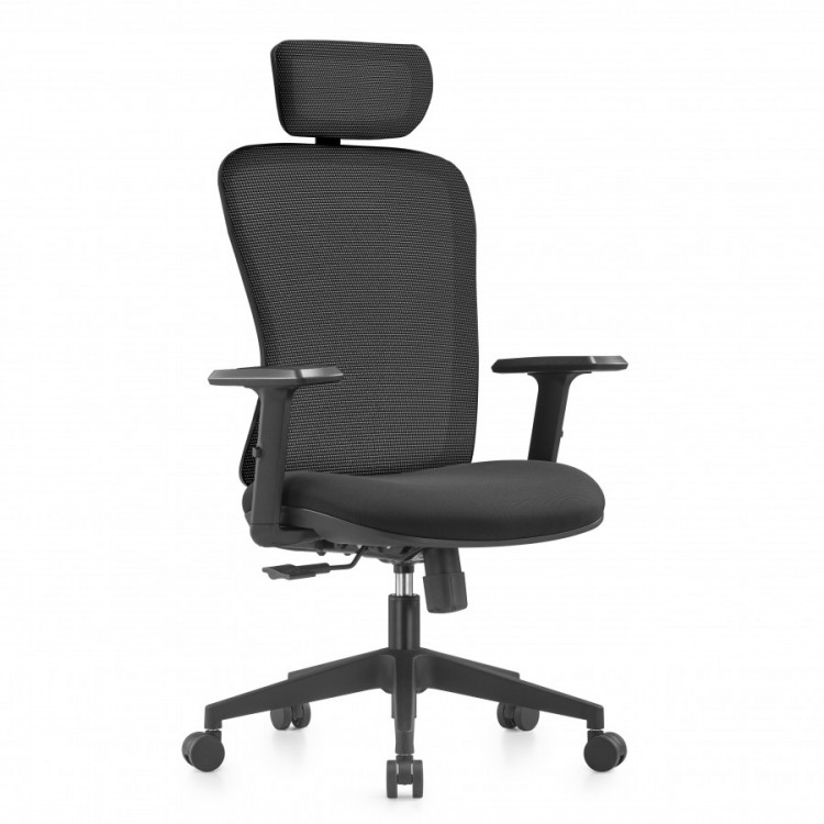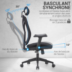 Fauteuil de bureau Noir gamme professionnelle. Assise rembourrée avec dossier en maille respirante et appui-tête réglable 2D. Accoudoirs réglables et mécanisme basculant synchrone. Confort et revêtement : - Assise en tissu noir grande élasticité - Garnissage mousse densité 35kg/m3 - Dossier et appui-tête tissu mesh tendu noir Mécanisme : - Mécanisme basculant synchrone avec dossier à contact permanent - Basculement blocable en 1 position Réglages : - Tension de bascule - Hauteur d'assise (+9 cm) - Hauteur des accoudoirs (+9 cm) - Hauteur appui-tête (+3 cm) - Inclinaison appui-tête (+30°) Structure : - Piètement 5 branches nylon noir Ø66 cm - Roulettes nylon Ø5,5 cm - Testé BIFMA Utilisation conseillée : - Durée quotidienne : + 7h - Charge maximale : 110 kg - Taille maximale : 190 cm - Garantie 3 ans Dimensions : - Hauteur totale : 114 à 126 cm - Hauteur assise : 42 à 51 cm - Hauteur accoudoirs : 63 à 81 cm - Dim. assise : L 50 x P 50 cm - Dim. dossier : L 46 x H 74/77 cm dont appui-tête : L 28 x H 16 cm - Etoile : Ø 66 cm - Roulettes : Ø 5,5 cm - Livré démonté, avec notice de montage