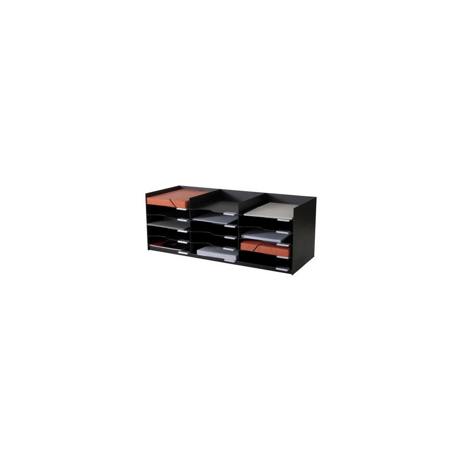 Bloc coloris noir de 15 cases pour classement horizontal des documents A4 ou 24x32 cm avec un accès rapide. Cases munies d’encoches avec porte-étiquettes et étiquettes fournis. Hauteur de case : 5.6 cm. Dim : H. 31,3 x L. 85,7 x P. 32,7 cm