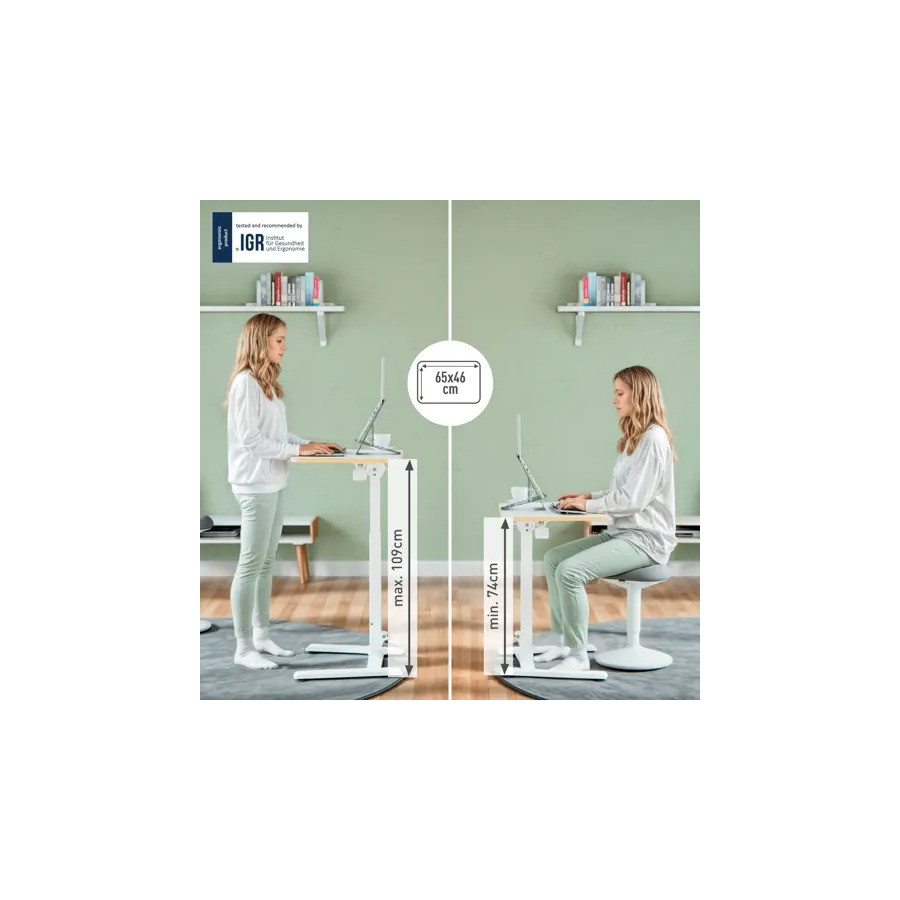 Avec son plateau spacieux de 65 x 46 cm, il accueille facilement votre ordinateur portable, clavier, souris et accessoires tout en gardant un encombrement minimal. Grâce à son mécanisme de réglage pneumatique, vous pouvez passer de la position assise à debout en douceur (hauteur réglable de 74 à 109 cm), favorisant ainsi une posture saine et une meilleure productivité.
