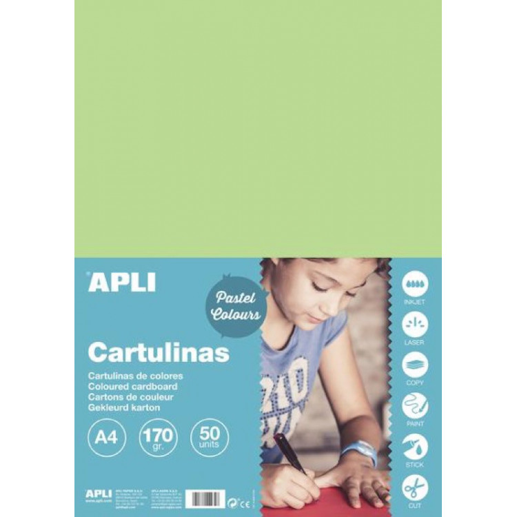 Cartons de couleur vert clair 170 g/m² format A4. Chaque pochette contient 50 cartons. Idéal pour tous travaux manuels , lettering, scrapbooking, couvertures, intercalaires, origami, impression de documents...Grâce à sa teinture, les cartons de couleur APLI offre un coloris plus homogène et net , sans aucune imperfection. Convient à un usage scolaire car ils ne contiennent pas dacides. Vous pourrez de plus trouver tous les coloris dont vous avez besoin parmi la large gamme de cartons de couleur APLI.