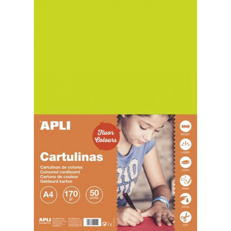 Cartons de couleur vert fluo 170 g/m² format A4. Chaque pochette contient 50 cartons. Idéal pour tous travaux manuels , lettering, scrapbooking, couvertures, intercalaires, origami, impression de documents...Grâce à sa teinture, les cartons de couleur APLI offre un coloris plus homogène et net , sans aucune imperfection. Convient à un usage scolaire car ils ne contiennent pas dacides. Vous pourrez de plus trouver tous les coloris dont vous avez besoin parmi la large gamme de cartons de couleur APLI.